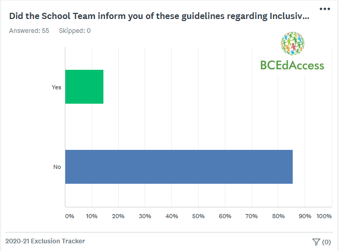 2) We asked if the school-based teams had made the families aware of the BC Ministry of Education’s direction which states, ” Students who require more support in school must have full-time, in-class instruction available without any delays.” Approximately 85% of our respondents stated NO, their school teams had not provided them this information.