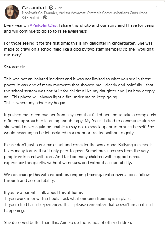 Please don’t just buy a pink shirt and consider the work done. Bullying in schools takes many forms. It isn’t only peer-to-peer. Sometimes it comes from the very people entrusted with care. And far too many children with support needs experience this quietly, without witnesses, and without accountability.